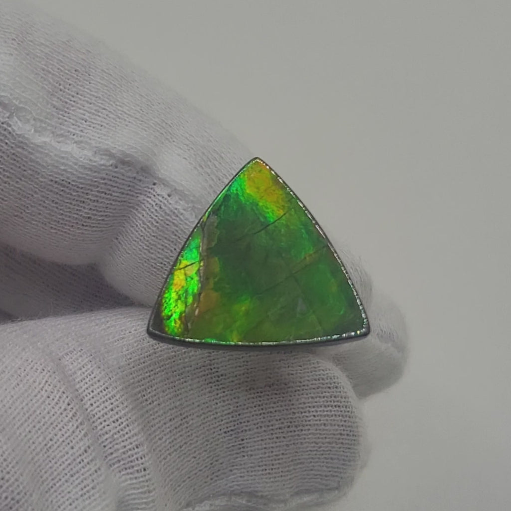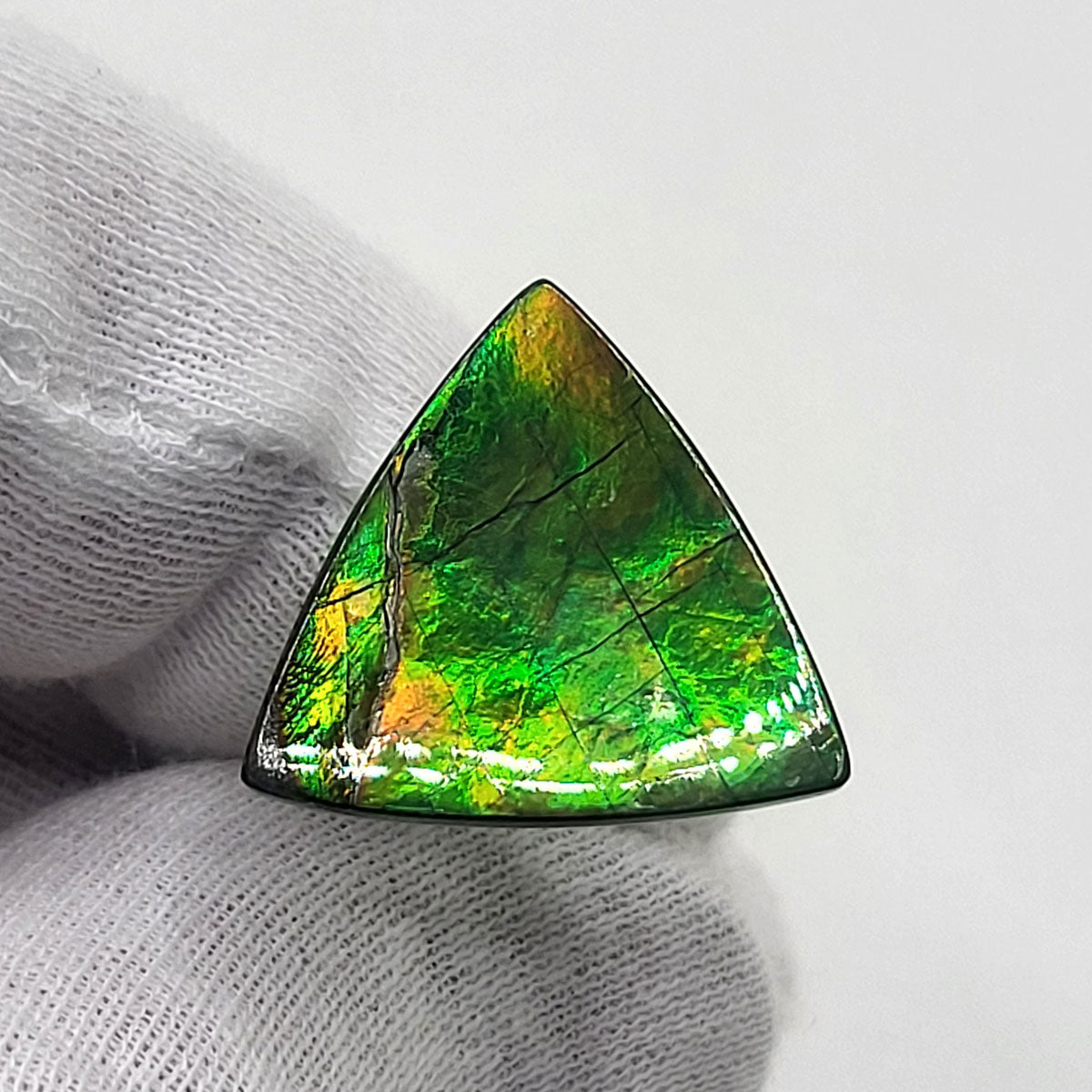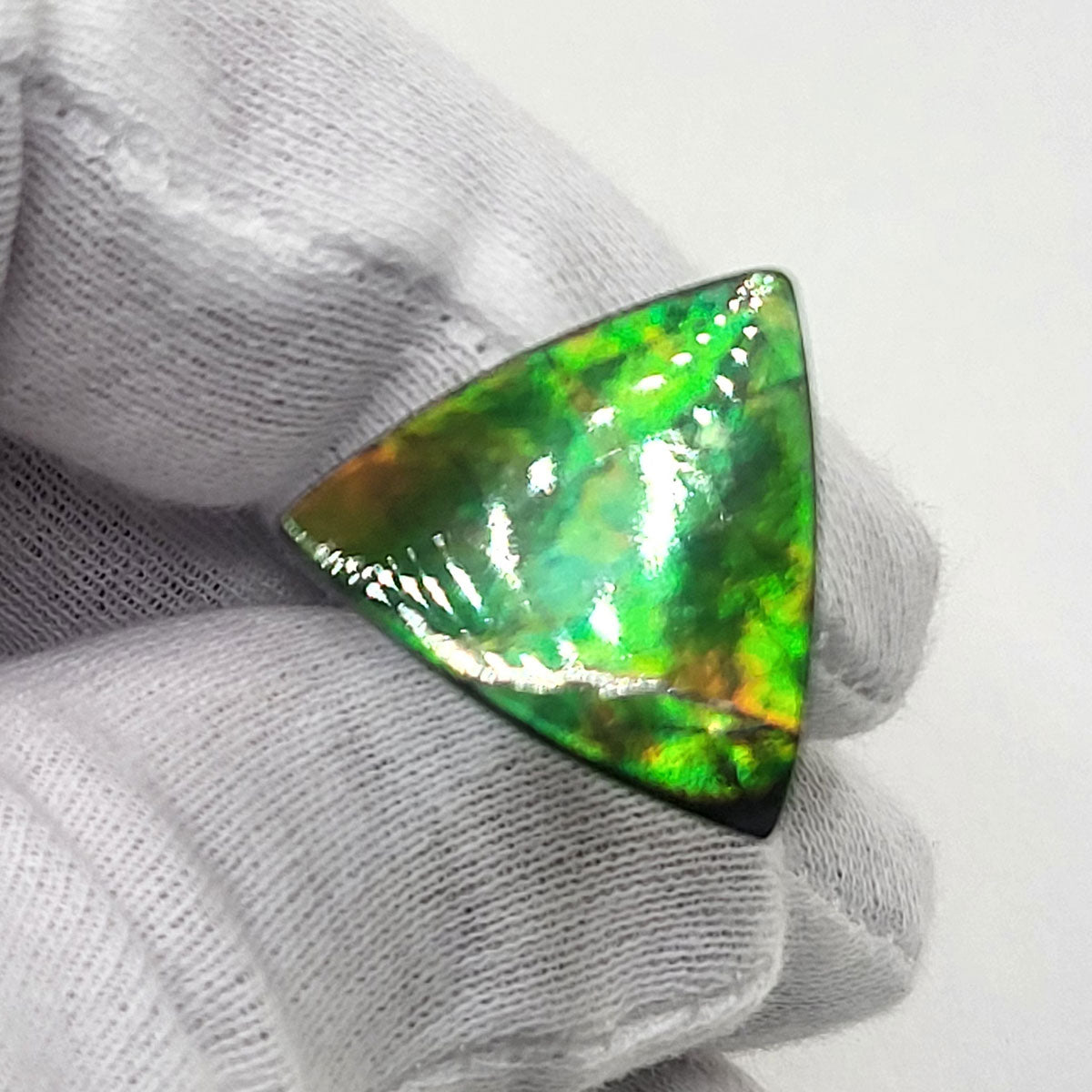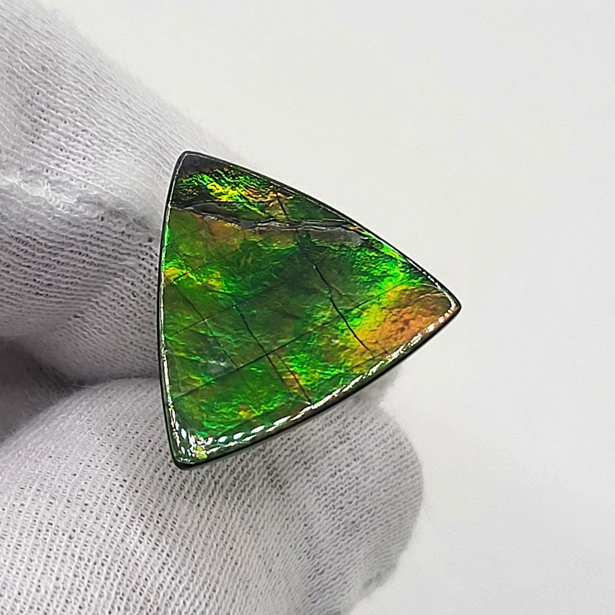 This Triangle shaped Freeform Loose Gemstone is hand crafted from Authentic Alberta Ammolite and is perfect for collectors and designers seeking to create breathtaking custom jewelry. It has been expertly hand-polished with 100,000 grit diamond polish to produce a dazzling shine.