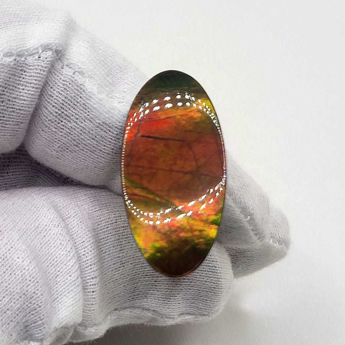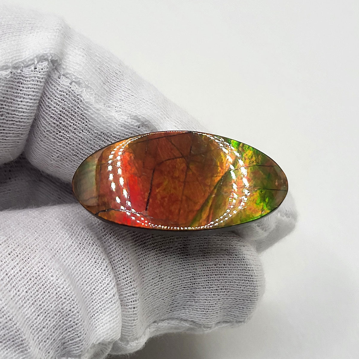 This Oval shaped Freeform Loose Gemstone is hand crafted from Authentic Alberta Ammolite and is perfect for collectors and designers seeking to create breathtaking custom jewelry. It has been expertly hand-polished with 100,000 grit diamond polish to produce a dazzling shine.