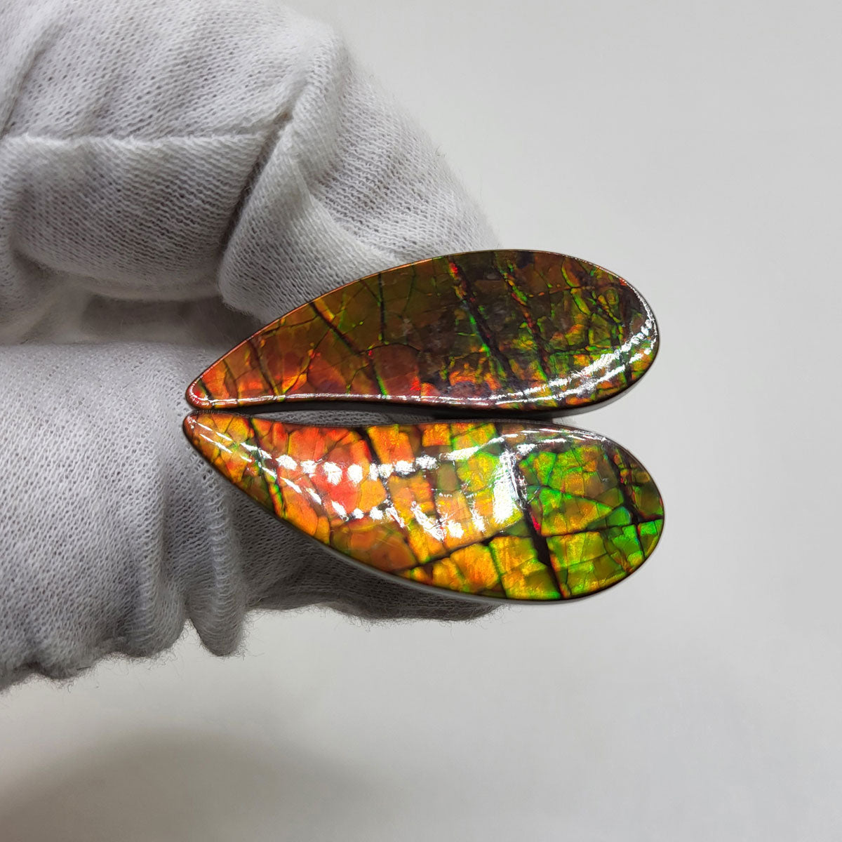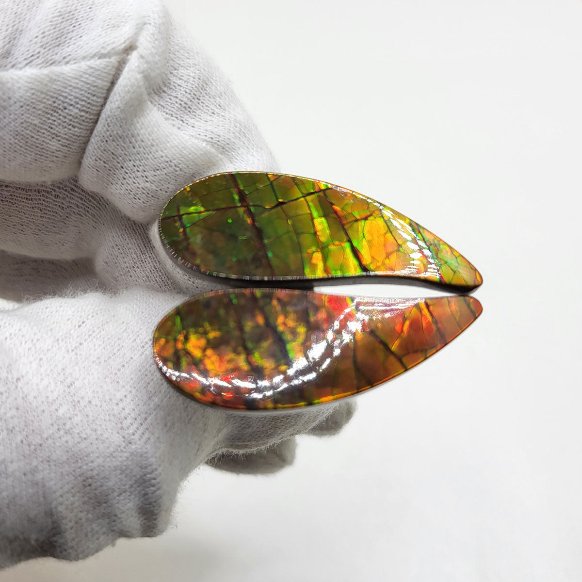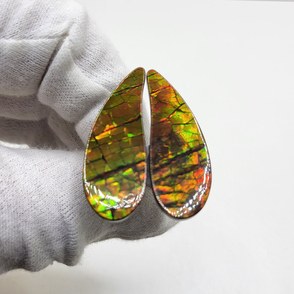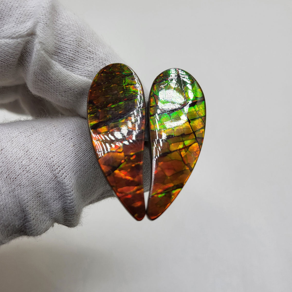 Swept Pear shaped, Matched Pair of Authentic Alberta Ammolite Freeform Gemstone as collector piece or as designer piece for customized jewellery.
