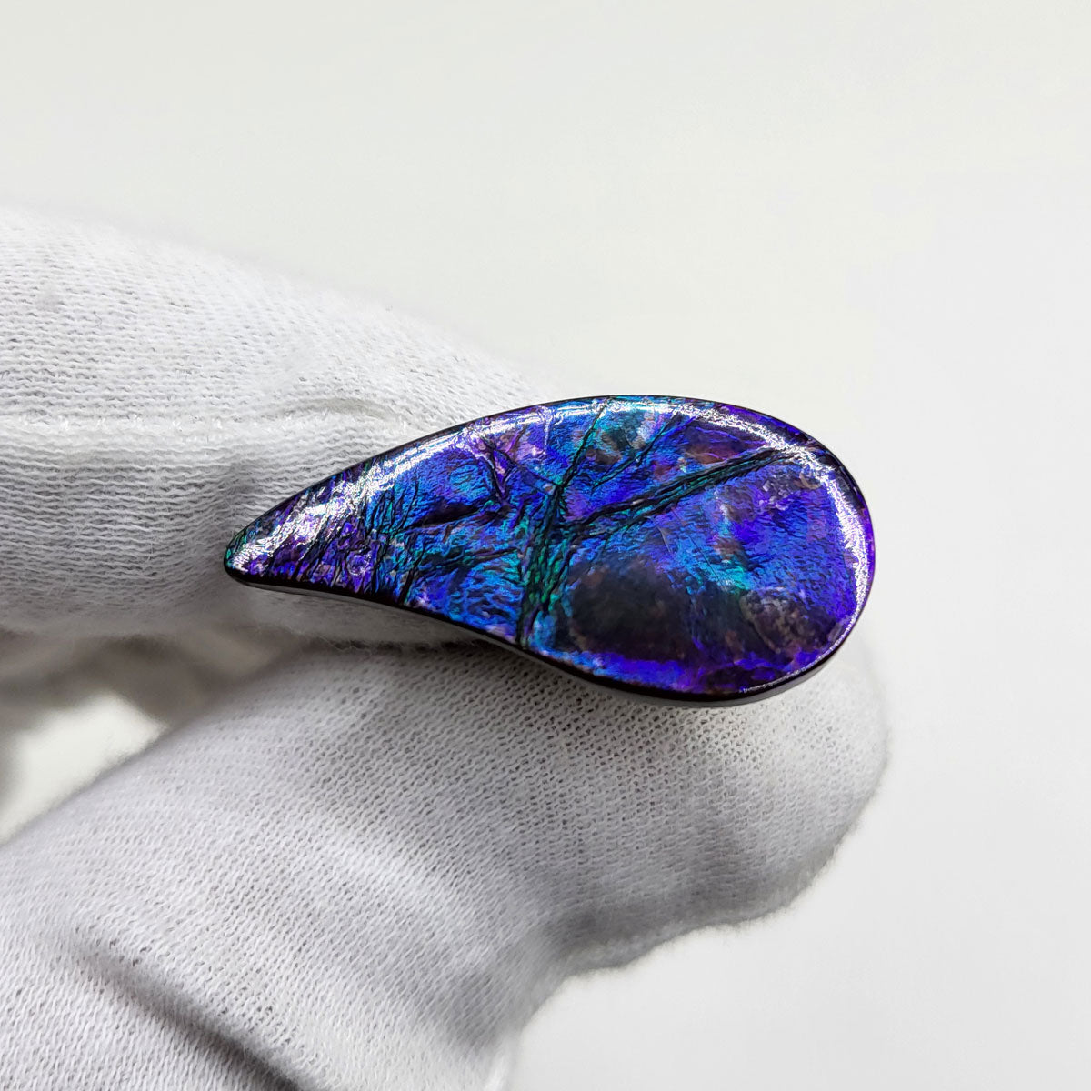 Swept Pear shaped Authentic Alberta Ammolite Freeform Gemstone as collector piece or as designer piece for customized jewellery.